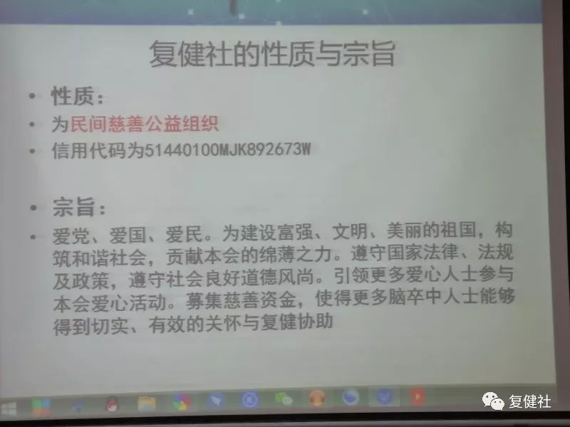 2019年1月12日,复健社2018年度总结表彰暨培训会于有思教育丰乐校区小学部成功举行。复健社立足为脑卒中人士提供居家与社区复健协助与关怀,把助力脑卒中人士改善和提升生活质量,追求实现生活自理、重归社会、实现生命更高的价值和意义作为其建社的宗旨,让其感受到生命中更多的温暖与力量,感受到生活的乐趣和色彩。