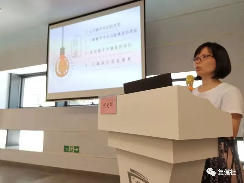 韩社长以居家复健期间,有50%的脑卒中人士会患上抑郁症为例(其中20%为严重抑郁症患者),指出心理因素在复健过程中所起的重要作用。并提出,脑卒中人士在复健路途上,关注点应该放在重塑自己的新生活方向上,而不是只是着眼于每天的复健训练。在追求、享受轻松愉快生活的同时,把复健训练糅合在生活中,常态化,让复健生活化,趣味化,才能够在面对长期单调、枯燥、乏味的复健训练时,有足够的力量坚持下去,从而获得复健后的新生。并最大程度远离复健过程中多种负面情绪的困扰与影响。真正实现身心俱健的复健目标。
