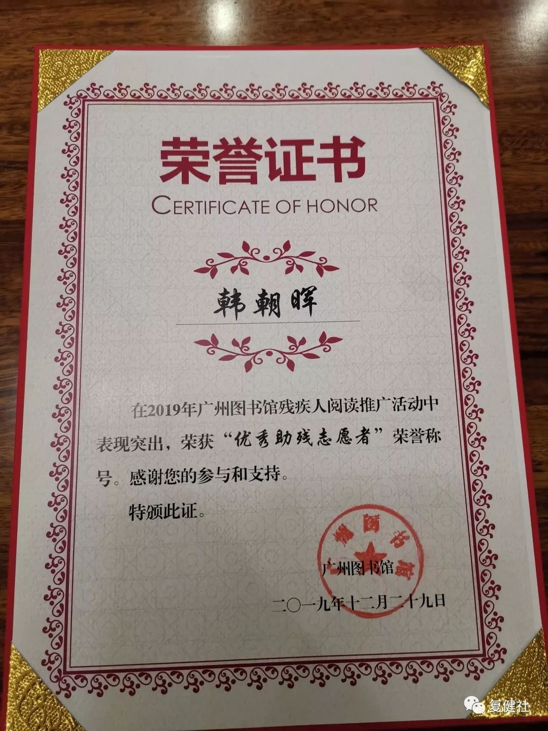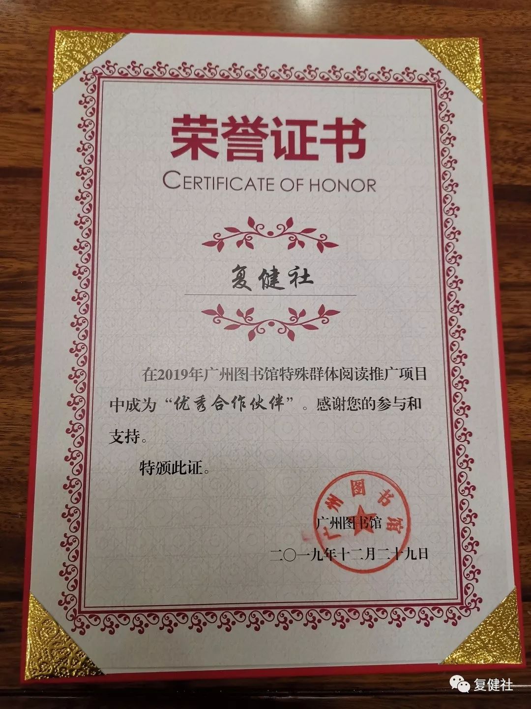 复健社荣膺2019年广州图书馆特殊群体阅读与推广项目“优秀合作伙伴”荣誉;韩朝晖社长荣膺“优秀助残志愿者”荣誉。